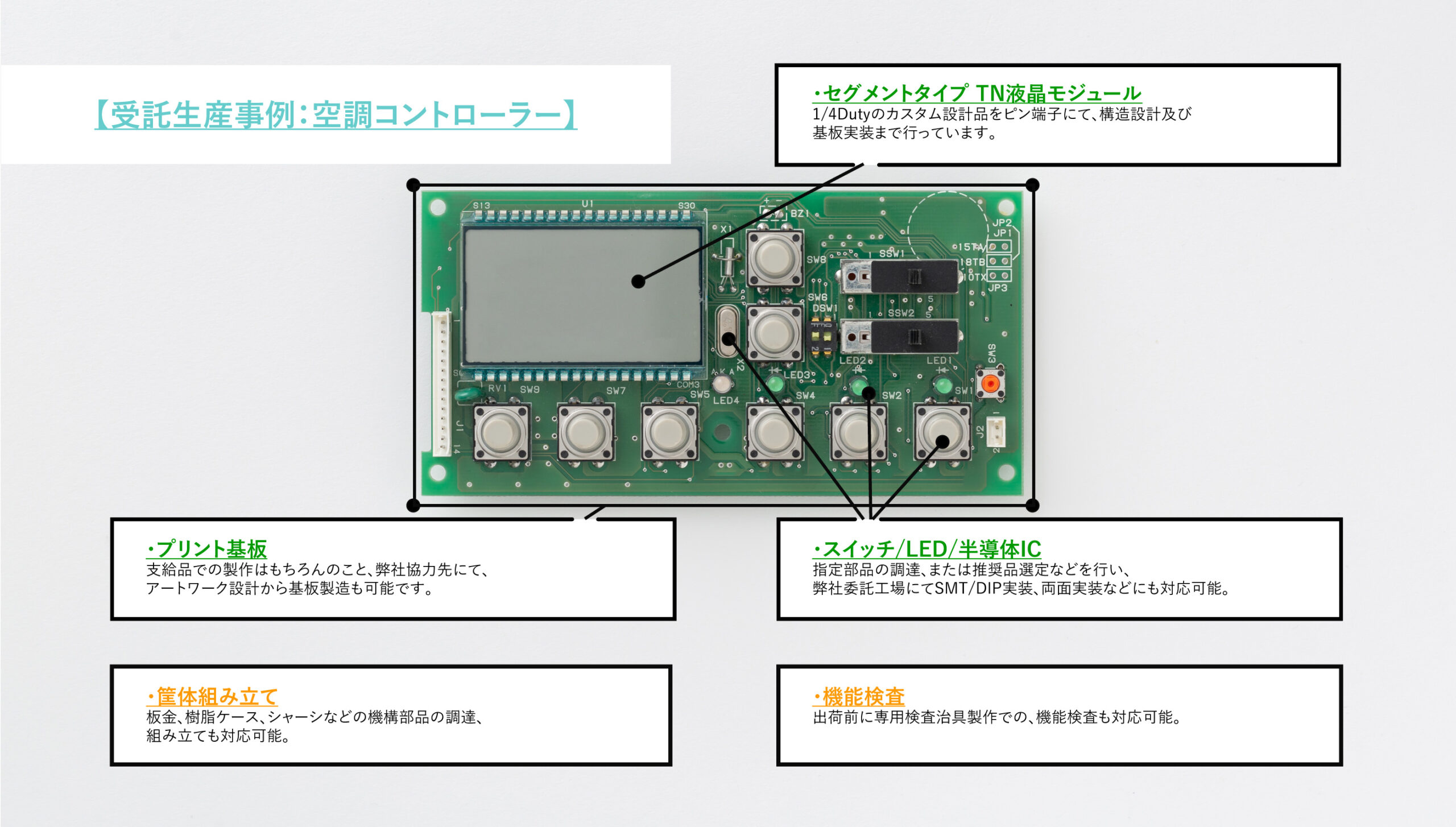 ディスプレイユニットの受託製造(ODM/OEM/EMS) Display Unit - ODM/OEM/EMS - Home > ディスプレイユニットの受託製造(ODM/OEM/EMS) ディスプレイユニットの設計・調達・生産をまとめて承ります 液晶(LCD)ユニットの設計開発・部品調達・受託生産(ODM/OEM/EMS)はお任せください。当社では、以下の部品も対応いたします。 ・表示周りのデバイス(CPU、メモリ等)・その他の周辺部品(操作スイッチ、表示灯LED等)・プリント基板や筐体 受託生産事例:空調コントローラ(※クリックで拡大表示)