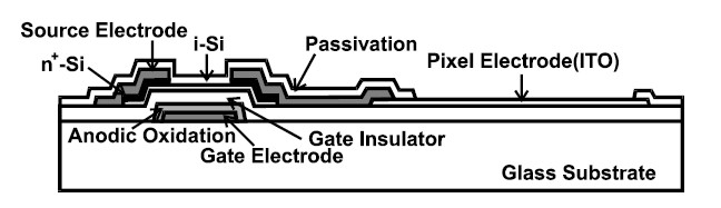 TFTはガラス基板上に形成される。主な構造は次の通り。